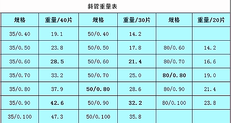 首先以我們常見的聚丙烯材質斜管填料為例子,聚丙烯材料的標準密度為920kg/m?。通常的斜管單片尺寸為1000*1000mm,延展為標準方形需求乘以1.3的比例。我們便可以根據斜管的片數和厚度計算出標準重量。例如直徑50mm斜管填料,厚度為0.5mm。每立方為30片,那么我們就可以計算得到0.0005*30*920*1.3=18kg。消費運用中經常用到的三種直徑規格35mm/50mm/80mm每立方的標準片數分別為40/30/20片。大家就可以根據這個基本計算方式推算出斜管填料標準重量。需求指出的是,計算采用的是全新聚丙烯原料的標準密度數,沒有運用全新料或者原料種類不同者不在討論范圍之內。下面為整理的參數表可以作為參考: