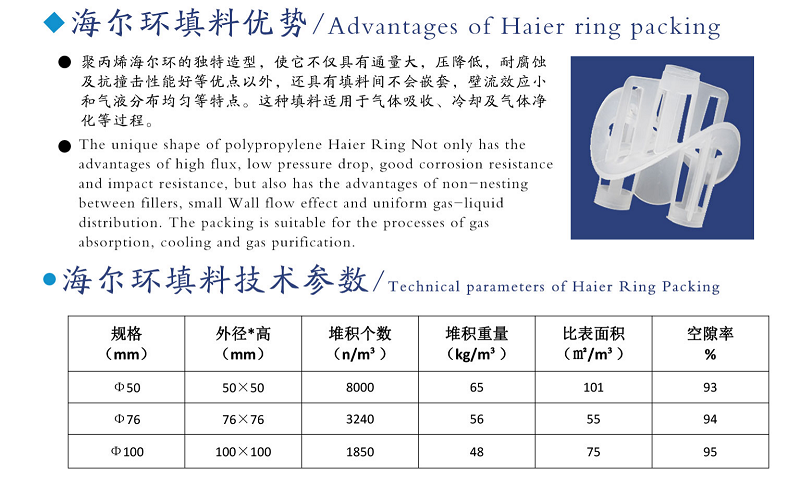 聚丙烯海爾環填料是用聚丙烯注塑成型的一種新型開孔填料,它最早是在國外被開發出來的。后來我國對這種填料進行了研究,并且成功的地開發出國產海爾環填料。