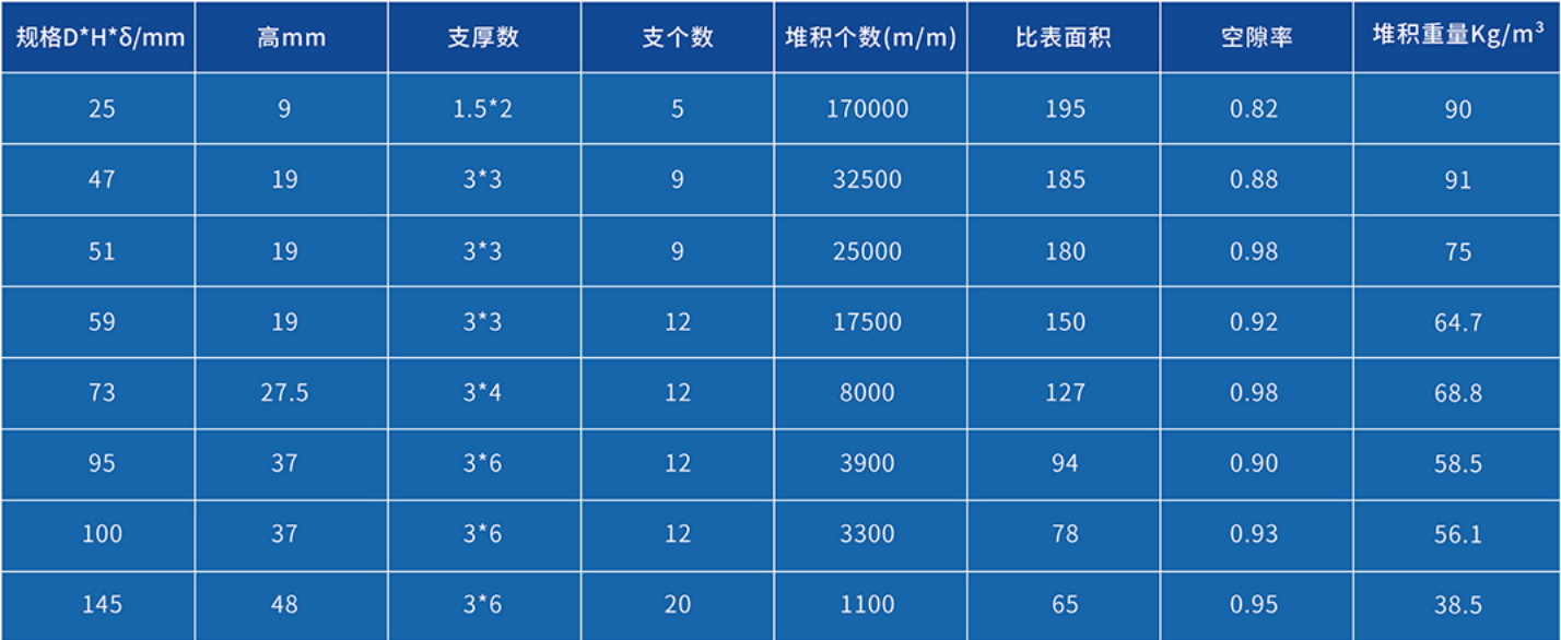 壓降低、能量大、傳質效率高,用戶可根據塔內使用條件(如溫度、壓勵、介質等)選擇不同材質如聚丙烯(PP)、增強聚丙烯(RPP)、 聚氯乙烯(PVC)、氯化聚氯Z烯(CPVC)、聚偏氟Z 烯(PVDF)等塑料,它具有空隙率大,壓降和傳質單元高度低,泛點高、汽液接觸充分、比重小、傳質效率高等特點。在各種介質中的使用溫度為60-150攝氏度,多用于氣體洗滌、凈化塔中。